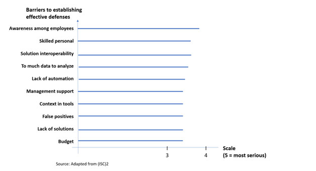 Why are we not more secure? We have the tools, and budget is not a top issue. Still, awareness among employees and lack of skills are the top barriers to establishing effective defenses, according to a study by (ISC)2 in 2021: