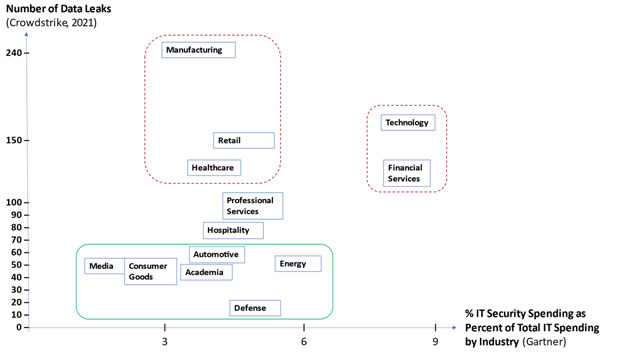 The number of Data Leaks compared to Security Spending Budget. Manufacturing, retail, technology (software and internet services), and healthcare are in the upper part: