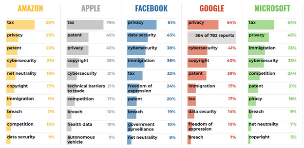 The Global Reporting Initiative (GRI) provides a useful set of tools for conducting a materiality assessment. The Ethical pillar concerns the way technology is shaping political, social, environmental and moral existence. Alessandro Mantelero’s work combining the Human Rights, Social and Ethical Impact Assessment (HRSEIA) with the Privacy Impact Assessment (PIA), can be a useful starting point to address ethical privacy[5]. The UK Data Ethics Framework[6] and the Omidyar Network’s Ethical OS[7]also provide useful tools for addressing this privacy risk.The Political pillar represents organizational activities such as lobbying for (or against)privacy issues such as national surveillance, freedom of speech, voting, democracy and privacy regulation. Organizations invest millions lobbying governments to favorably shape privacy legislation e.g. privacy was the most frequently used word in the lobbying submissions and was in the top-5 lobby interests of all Big Tech organizations as illustrated in Figure 2.[i]