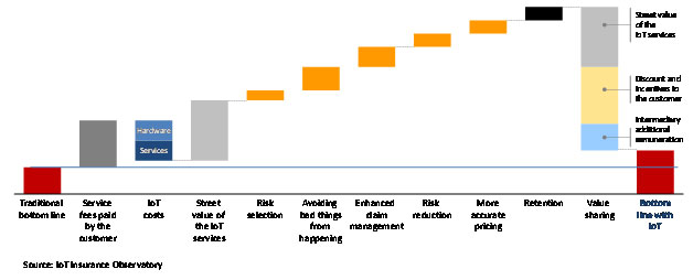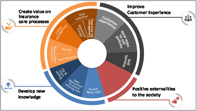 - Improving customer experience by enhancing proximity and interaction frequency with them, therefore moving beyond the traditional risk transfer. Many players are selling additional services for a monthly fee, others have found new ways to sell insurance coverages thanks to IoT;