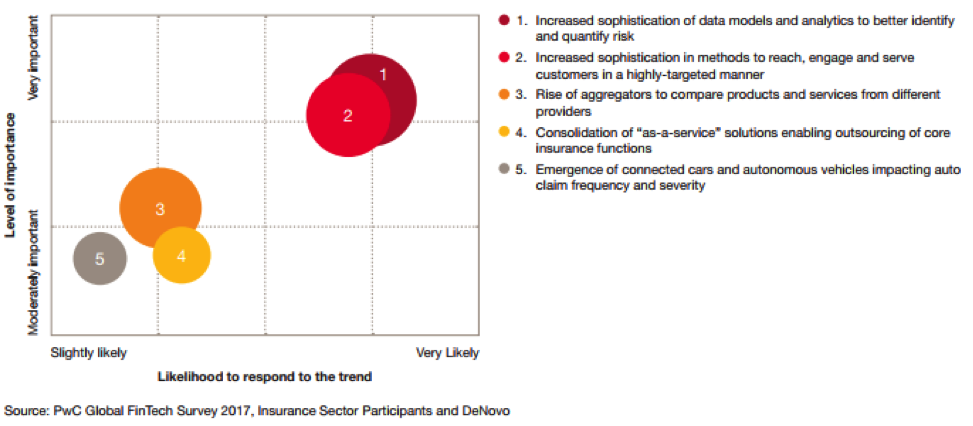 This hypothesis is supported by the most recent researches – for instance, according to Global InsurTech Report[2] based on the responses of 189 senior insurance sector executives from 40 countries, insurers’ focus has shifted to become more customer centric. Increased sophistication of risk models and higher servicing and customer engagement levels are identified as the most important innovation trends by 94% of respondents taking part in the survey. There are even companies that are already exploiting this trend – UK based Bought By Many crawls internet and social media to identify the unaddressed needs of the customers, pools them in groups and creates policies that suit them better. An example of such policy might be insurance for kittens or African parrots – selling insurance for African parrots may not sound serious enough for an insurance agent wearing a tie, however, Bought By Many proves this is a very viable business case that has to be taken seriously – this is what the market demands and insurance companies should listen.