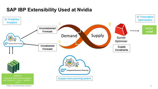 leveraging traditional statistics and AI/ML that will be able to handle high fluctuations in demand and understand the complexity from multiple demand indicators. Finally prescriptive optimization models leveraging operations research algorithms are needed to incorporate material and capacity constraints into the supply chain plans. We began our journey by modernizing our Forecasting system first. After an extensive evaluation of multiple tools, we selected SAP IBP. SAP IBP is a cloud-based solution, offering flexibility, scalability, and easy accessibility. IBP integrates seamlessly with other SAP solutions, such as SAP ERP, BW and APO, enabling a unified planning process. Our planners need options on UI and only IBP offers both a web-based UI along with Excel add-ins.It took us 9 months to implement IBP Demand Planning for our consumer business units and another 9 months for our enterprise business units. We now have a total of 250+ users spread across the globe. We had moved 12+ separate Excel models for the different Nvidia business units into IBP resulting in more consistent and improving forecast results. We estimate about 10K+ hours of productivity savings per year for our planners. Cycle time from sell through forecast to revenue target setting has been reduced from 8 days to 4 days.SAP IBP offers advanced analytics and scenario modeling capabilities that we use for our simpler use cases. But some of our use cases require more advanced AI/ML models such as sell through forecasting of our desktop and notebook business units.