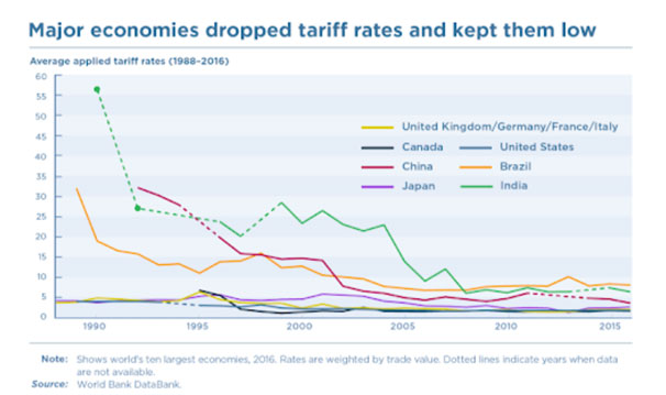 The wages also saw growth, but inflation had to be kept under check. The fall of the iron curtain in 1989-90 and the end of the cold war of 1991 heralded an era when the biggest economies embraced the idea of a truly global economy. In 1989, exports rose to 14 percent of global GDP – its highest level since the pre-world-war years. The following few years saw significant economies drop trade tariffs to unprecedented lows, where they have stayed since (figure 2). [caption id="attachment_10100" align="aligncenter" width="606"]
