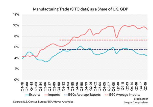 Figure 1: Lowered trade barriers ushered in globalization[/caption] The lowering of trade barriers gave producers the world over a great opportunity to fulfill the demand of consumers in high-income countries, including the U.S. As a result, imports to the U.S. rose substantially since the 1980s; however, the share of exports stayed at the same level and even began to fall by the 2010s (figure 4). [caption id="attachment_10101" align="aligncenter" width="606"]