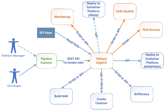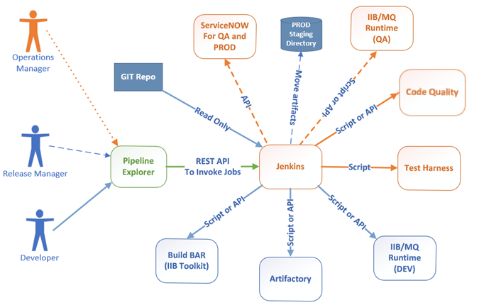 The Traditional ESB Pipeline introduces new functionality while maintaining the hub-and-spoke operations in place. For many integration teams, established CI/CD orchestrators such as Jenkins continue to play a valuable role in managing the controlled release cycles of core ACE and MQ components, where predictability and governance take precedence.