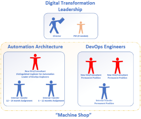 This should be considered a strategic endeavor requiring formation of new teams: The Automation Architecture Team and DevOps Engineering Team.Some organizations where such teams operate are collectively called a “Machine Shop” as that’s what they do: a workshop for making or repairing mechanical items.