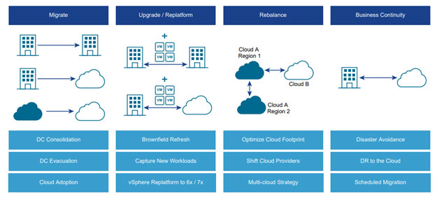 Workload rebalancing: HCX provides a multi-cloud mobility platform across cloud regions and cloud providers to allow customers to move applications and workloads at any time to meet scale, cost management, compliance, and vendor neutrality goals.