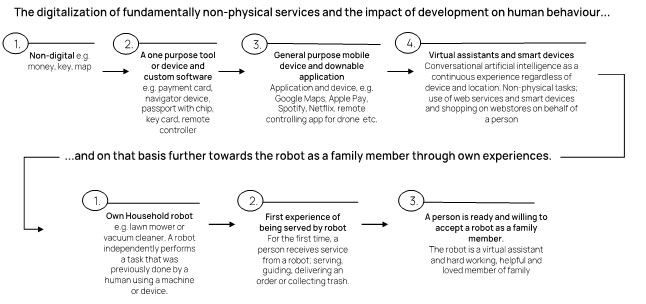 Picture1. From digitalization to roboticization. Long journey to accept robot as a family member. The claim that around 15 percent of households will have their own robot in 2025, which is at least as much a family member as a pet, sounds quite implausible. Path from this moment to that point can be seen anyway. It is likely that the robotization of families will take more time, on the other hand, it will be a more significant and far-reaching change than currently thought. Our attitude towards robots and the idea of living together with robots will change significantly in the next ten years due to the combined effect of own experiences, values, and lifestyles. We already have single use robots such as robot vacuums and robot lawn movers. Robots among us are performing quite simple but important and time-consuming tasks for us. We face service robots more often on airports, hotels, stores, restaurants, and office buildings. Sad but true the soldiers meet robots on battlefields. We need robots to hospitals and nursing homes, not battlefields.